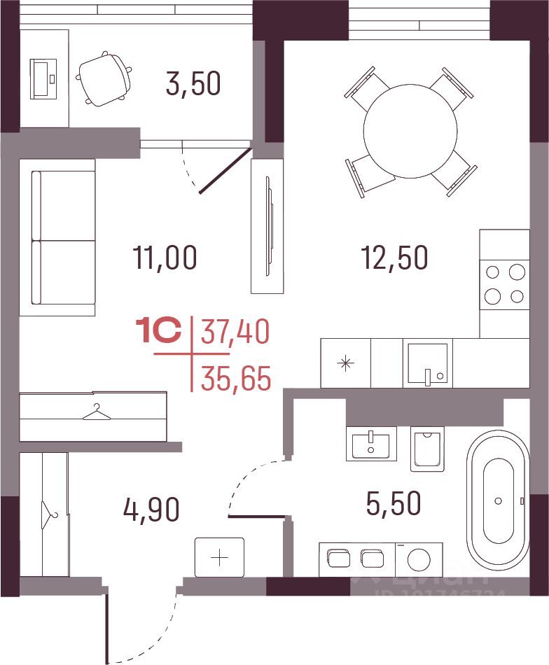 Студия (смарт 1к квартира) свободной планировки с дизайнерской отделкой. Квартира правильной квадратной формы, есть выход на лоджию.
