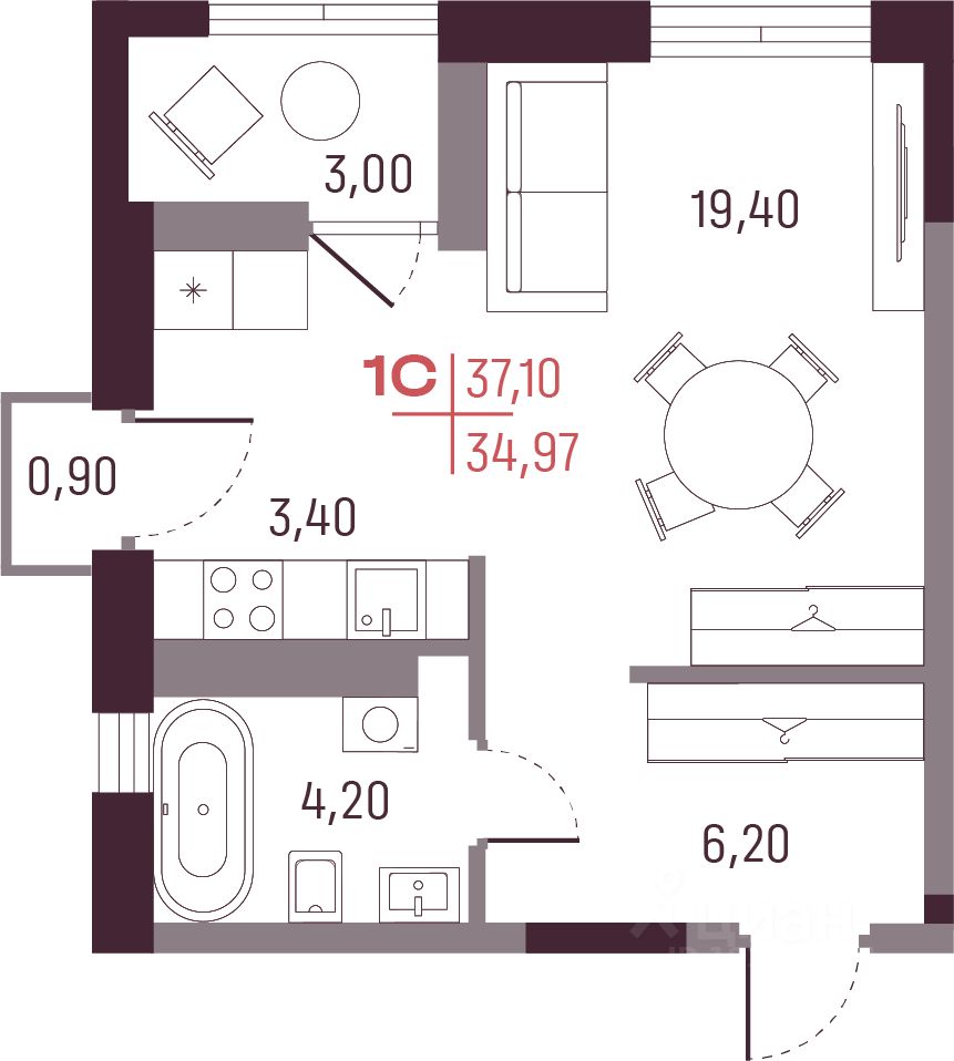 34,97 м²