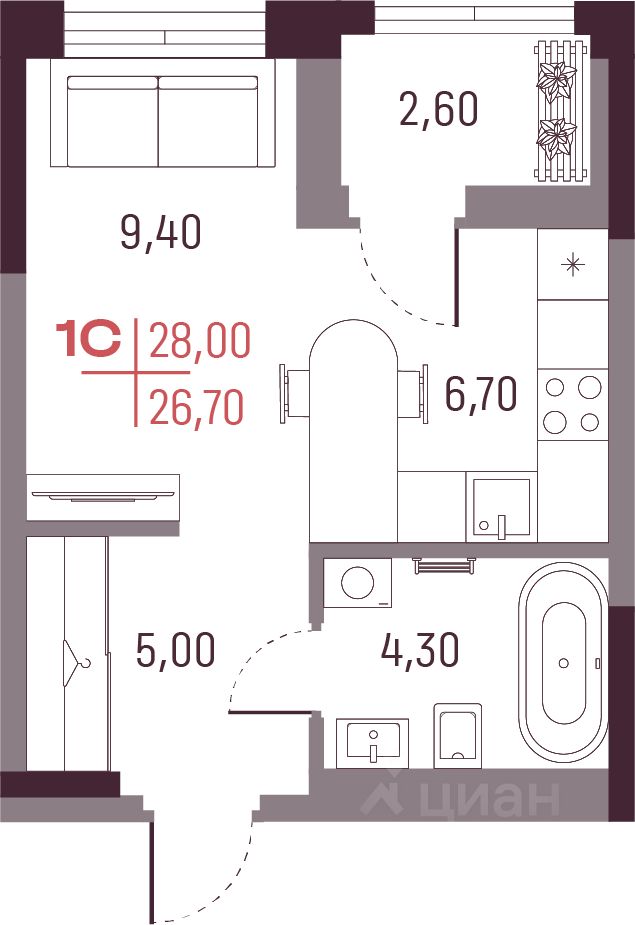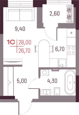 Студия (смарт 1к квартира). Квартира правильной квадратной формы, есть выход на лоджию.