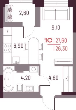 Студия (смарт 1к квартира). Квартира правильной квадратной формы, есть выход на лоджию.