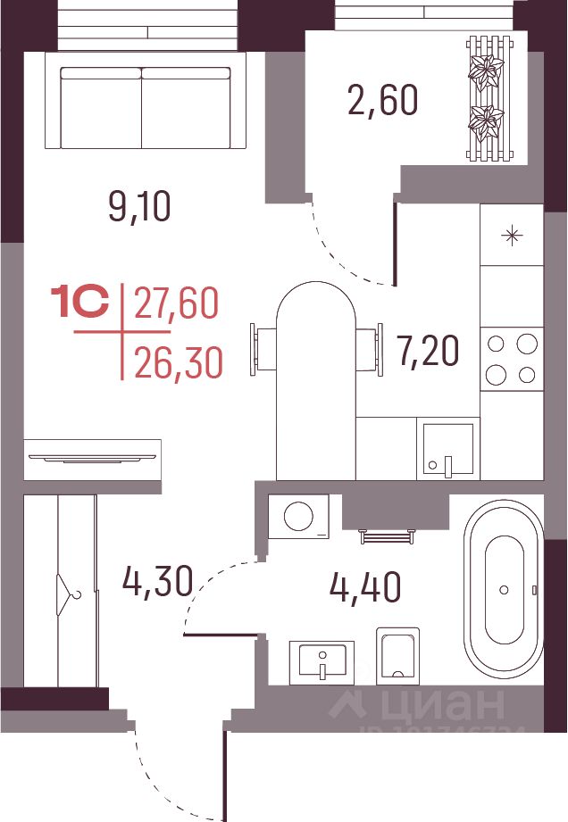 Студия (смарт 1к квартира). Квартира правильной квадратной формы, есть выход на лоджию.