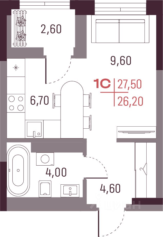 Студия (смарт 1к квартира). Квартира правильной квадратной формы, есть выход на лоджию.