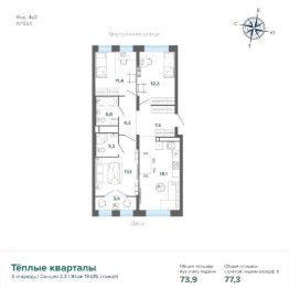 Теплые кварталы - квартальная застройка переменной этажности (от 7 до 25).Комплекс будет состоять из 5 очередей. В продаже 3 очередь, дом 2 - переменной этажности. Строительство уже ведется.