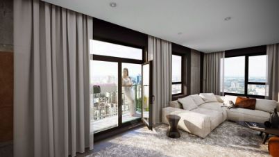 Современная архитектура. Долговечные фасады из навесных панелей и штукатурки, увеличенные окна и французские балконы формируют уникальный узнаваемый образ. Ночная подсветка выделяет дом среди застройки района и подчеркивает выразительность его силуэта.