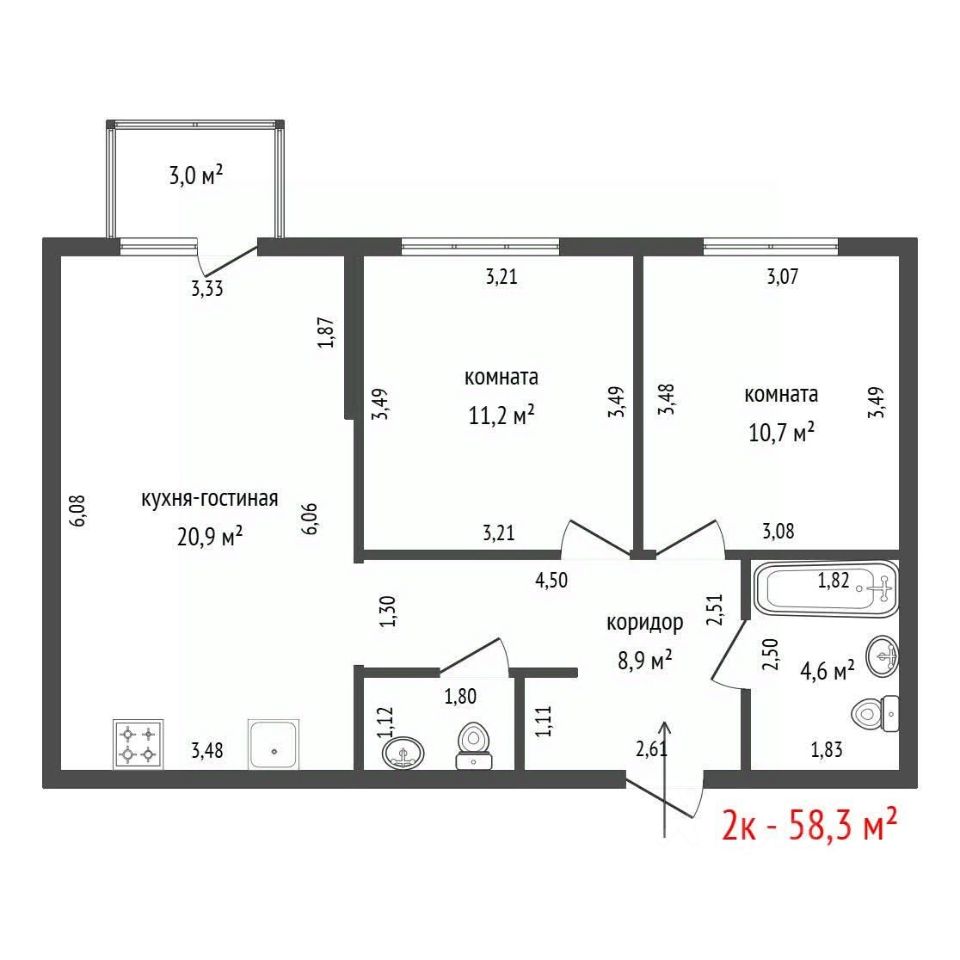 - Просторная кухня-гостиная 20,9 кв.м и две изолированные комнаты 11,2 и 10,7 кв.м.
