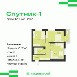 Продается 2-комнатная квартира площадью 55.32 кв.м. от девелопера "Академический" в жилом квартале "Спутник 1". Срок сдачи дома в 2027 году.