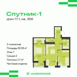 Продается 2-комнатная квартира площадью 58.58 кв.м. от девелопера "Академический" в жилом квартале "Спутник 1". Срок сдачи дома в 2027 году.