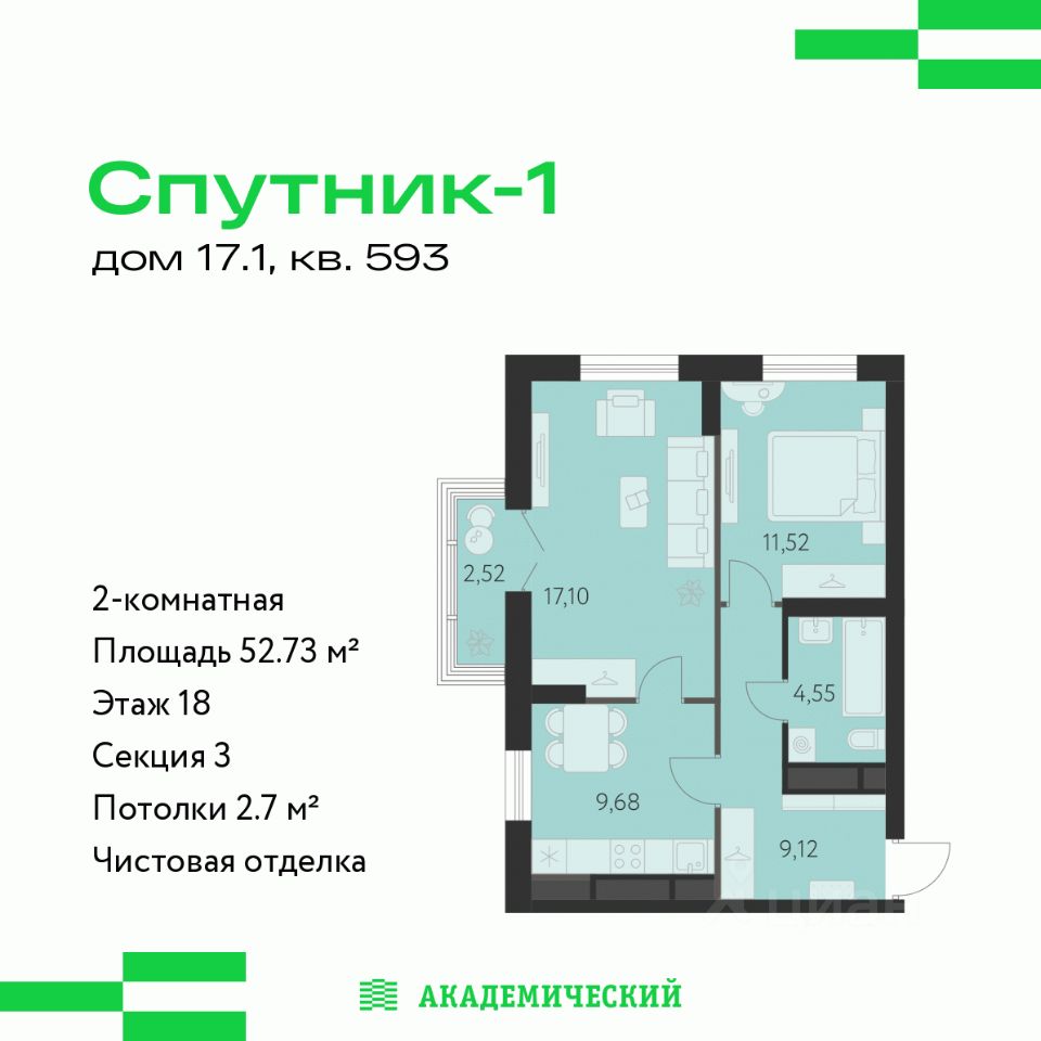 Продается 2-комнатная квартира площадью 52.73 кв.м. от девелопера "Академический" в жилом квартале "Спутник 1". Срок сдачи дома в 2027 году.