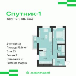 Продается 2-комнатная квартира площадью 52.66 кв.м. от девелопера "Академический" в жилом квартале "Спутник 1". Срок сдачи дома в 2027 году.