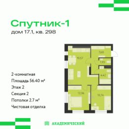 Продается 2-комнатная квартира площадью 56.4 кв.м. от девелопера "Академический" в жилом квартале "Спутник 1". Срок сдачи дома в 2027 году.