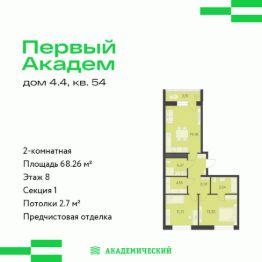 Продается 2-комнатная квартира площадью 68.26 кв.м. от девелопера "Академический" в жилом квартале "Первый Академ". Срок сдачи дома в 2028 году.