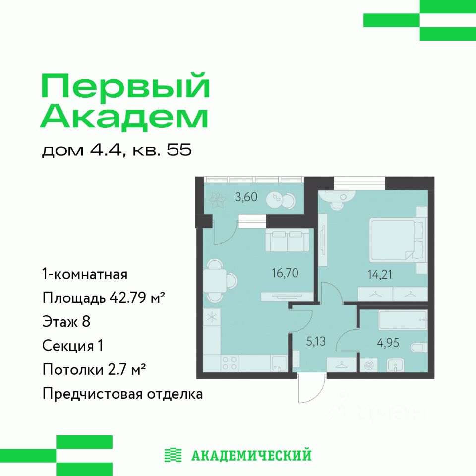 Продается 1-комнатная квартира площадью 42.79 кв.м. от девелопера "Академический" в жилом квартале "Первый Академ". Срок сдачи дома в 2028 году.
