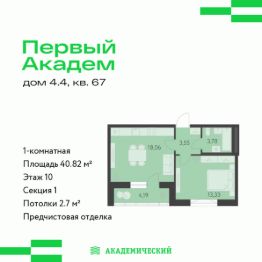 Продается 1-комнатная квартира площадью 40.82 кв.м. от девелопера "Академический" в жилом квартале "Первый Академ". Срок сдачи дома в 2028 году.