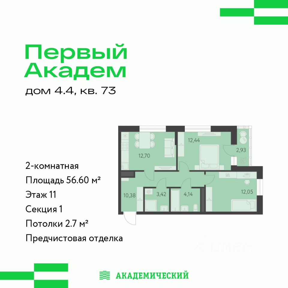 Продается 2-комнатная квартира площадью 56.6 кв.м. от девелопера "Академический" в жилом квартале "Первый Академ". Срок сдачи дома в 2028 году.