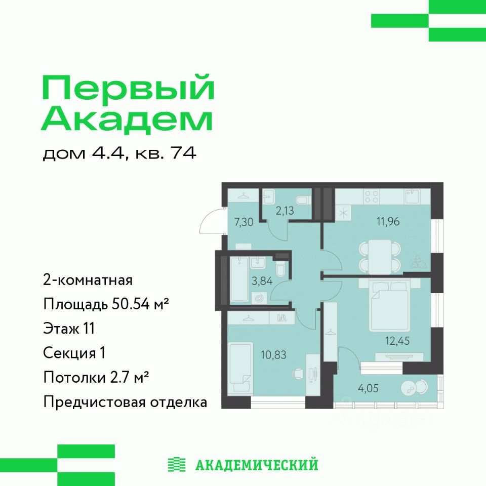 Продается 2-комнатная квартира площадью 50.54 кв.м. от девелопера "Академический" в жилом квартале "Первый Академ". Срок сдачи дома в 2028 году.