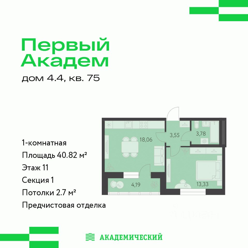 Продается 1-комнатная квартира площадью 40.82 кв.м. от девелопера "Академический" в жилом квартале "Первый Академ". Срок сдачи дома в 2028 году.