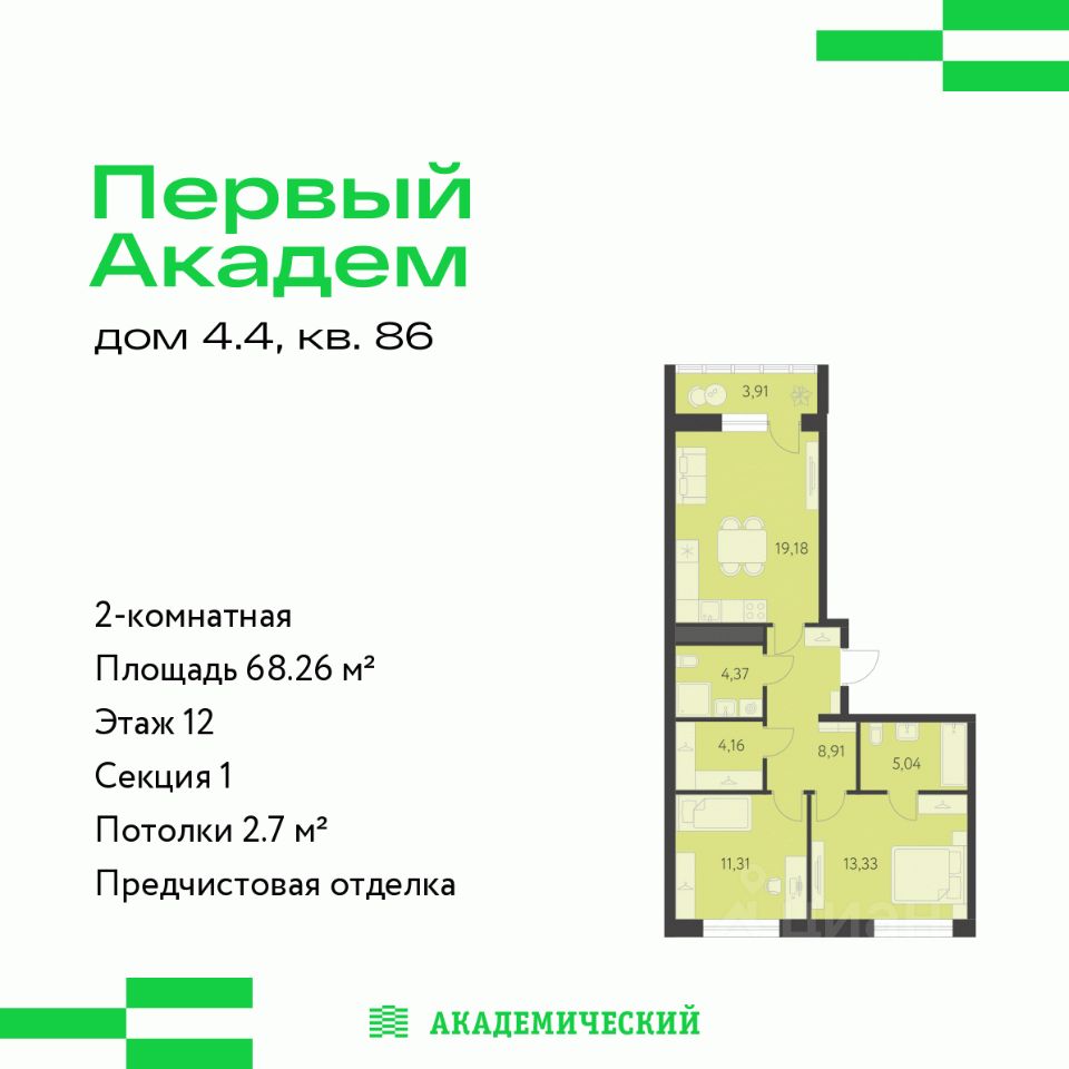 Продается 2-комнатная квартира площадью 68.26 кв.м. от девелопера "Академический" в жилом квартале "Первый Академ". Срок сдачи дома в 2028 году.