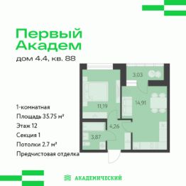 Продается 1-комнатная квартира площадью 35.75 кв.м. от девелопера "Академический" в жилом квартале "Первый Академ". Срок сдачи дома в 2028 году.