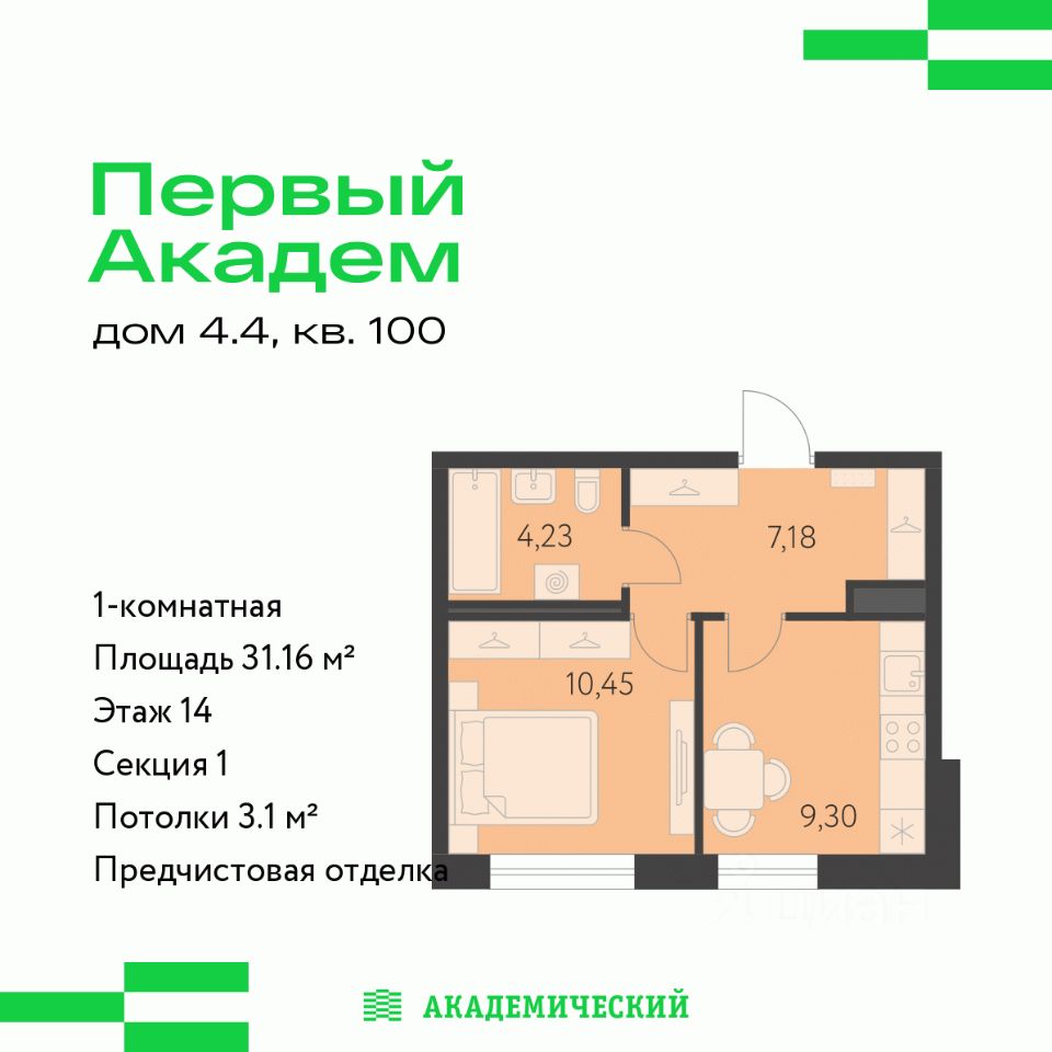 Продается 1-комнатная квартира площадью 31.16 кв.м. от девелопера "Академический" в жилом квартале "Первый Академ". Срок сдачи дома в 2028 году.