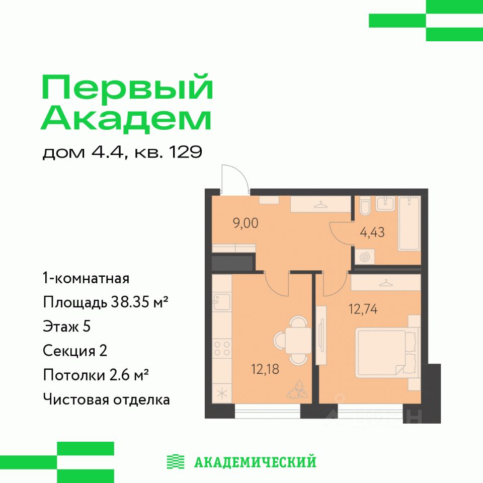 Продается 1-комнатная квартира площадью 38.35 кв.м. от девелопера "Академический" в жилом квартале "Первый Академ". Срок сдачи дома в 2028 году.