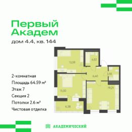 Продается 2-комнатная квартира площадью 64.59 кв.м. от девелопера "Академический" в жилом квартале "Первый Академ". Срок сдачи дома в 2028 году.