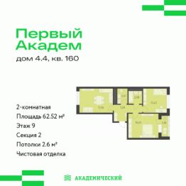Продается 2-комнатная квартира площадью 62.52 кв.м. от девелопера "Академический" в жилом квартале "Первый Академ". Срок сдачи дома в 2028 году.