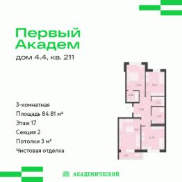 Продается 3-комнатная квартира площадью 84.81 кв.м. от девелопера "Академический" в жилом квартале "Первый Академ". Срок сдачи дома в 2028 году.