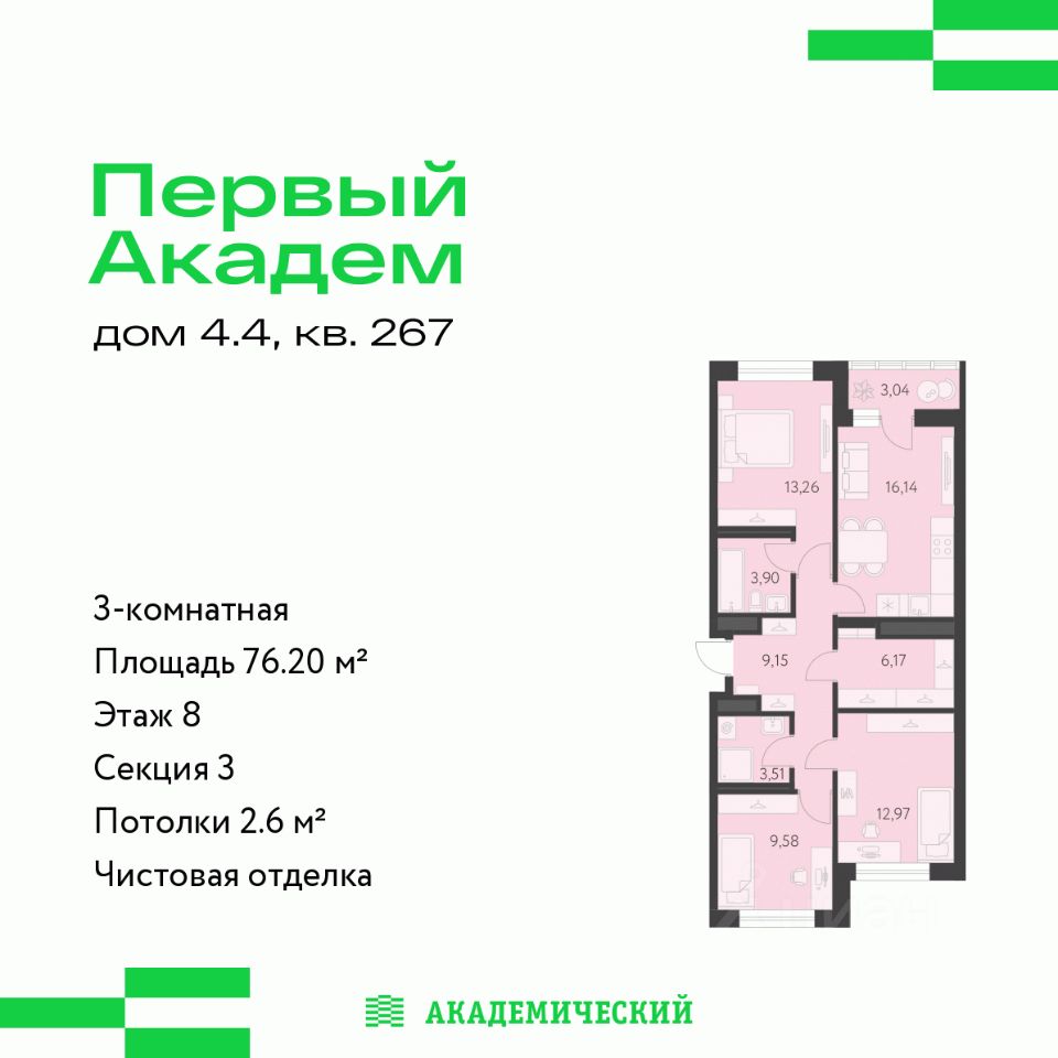 Продается 3-комнатная квартира площадью 76.2 кв.м. от девелопера "Академический" в жилом квартале "Первый Академ". Срок сдачи дома в 2028 году.