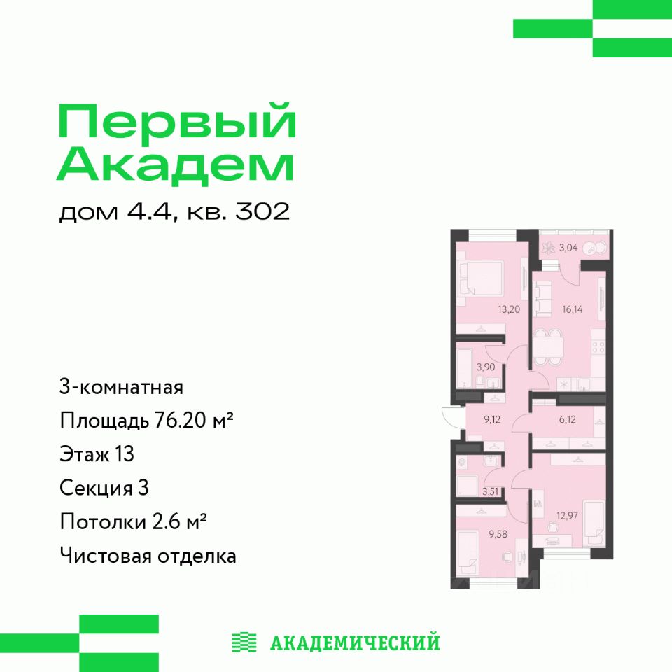 Продается 3-комнатная квартира площадью 76.2 кв.м. от девелопера "Академический" в жилом квартале "Первый Академ". Срок сдачи дома в 2028 году.