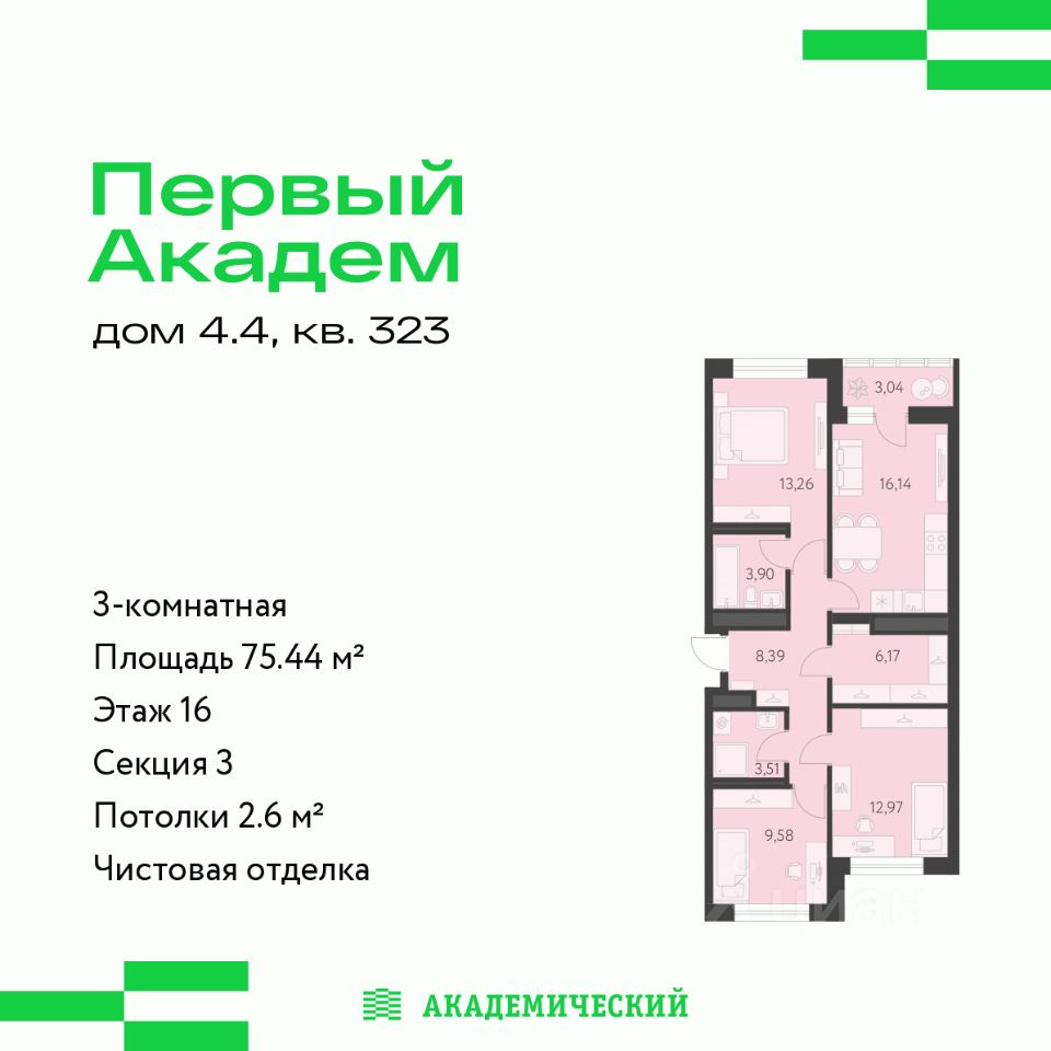 Продается 3-комнатная квартира площадью 75.44 кв.м. от девелопера "Академический" в жилом квартале "Первый Академ". Срок сдачи дома в 2028 году.