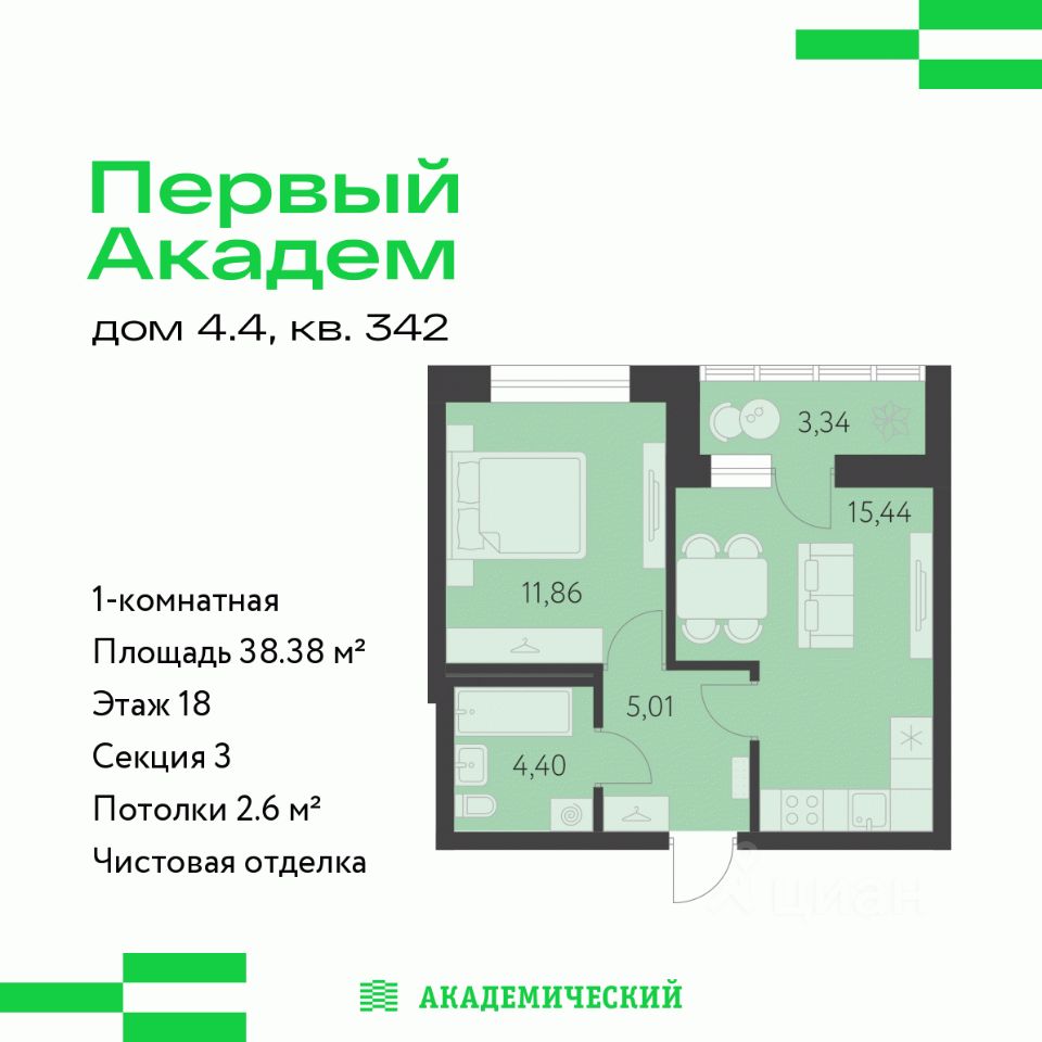 Продается 1-комнатная квартира площадью 38.38 кв.м. от девелопера "Академический" в жилом квартале "Первый Академ". Срок сдачи дома в 2028 году.