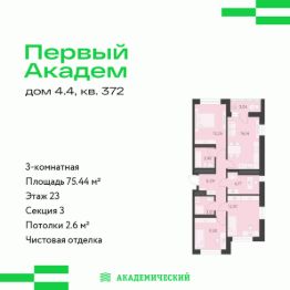 Продается 3-комнатная квартира площадью 75.44 кв.м. от девелопера "Академический" в жилом квартале "Первый Академ". Срок сдачи дома в 2028 году.