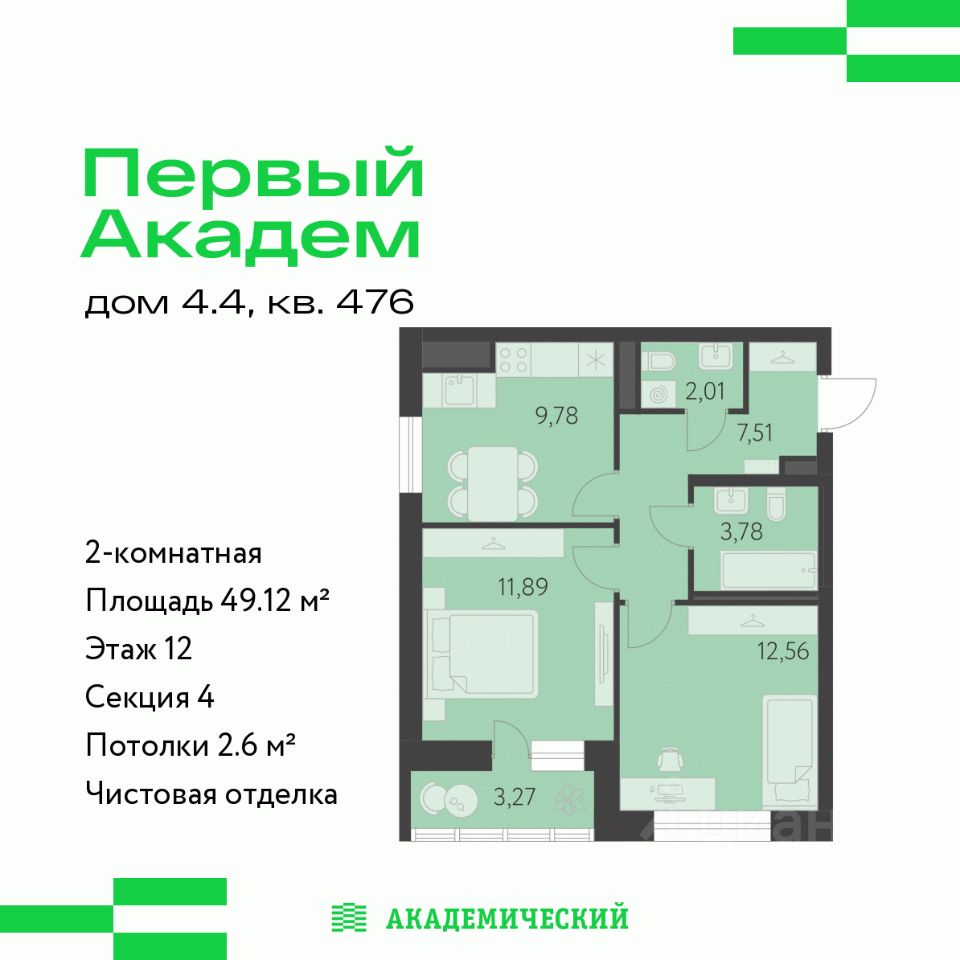 Продается 2-комнатная квартира площадью 49.12 кв.м. от девелопера "Академический" в жилом квартале "Первый Академ". Срок сдачи дома в 2028 году.