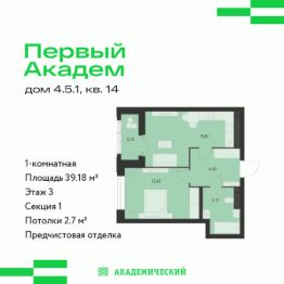 Продается 1-комнатная квартира площадью 39.18 кв.м. от девелопера "Академический" в жилом квартале "Первый Академ". Срок сдачи дома в 2026 году.