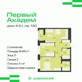 Продается 2-комнатная квартира площадью 56.88 кв.м. от девелопера "Академический" в жилом квартале "Первый Академ". Срок сдачи дома в 2026 году.