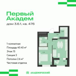 Продается 1-комнатная квартира площадью 40.45 кв.м. от девелопера "Академический" в жилом квартале "Первый Академ". Срок сдачи дома в 2026 году. Выгоды и скидка напрямую от застройщика.