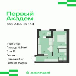 Продается 1-комнатная квартира площадью 36.84 кв.м. от девелопера "Академический" в жилом квартале "Первый Академ". Срок сдачи дома в 2026 году. Выгоды и скидка напрямую от застройщика. Дом расположен на въезде в район, отличается удобной транспортной развязкой. Рядом новая трамвайная линия и остановка общественного транспорта. Три дома разной этажности. Эко-тренды во дворах. Холлы и фасады в стиле ар-деко. В продаже имеются квартиры с видом на парк. На территории квартала предусмотрено множество удобств для жильцов, включая видеонаблюдение 24/7, двор без машин, кладовые и подземный паркинг с выходом из лифта, коммерция на первых этажах. В числе особых преимуществ близость к Юго-западному лесопарку и ТРЦ "Академический": магазины, кафе, парк развлечений, кинотеатр, фитнесс-центр с бассейном.
