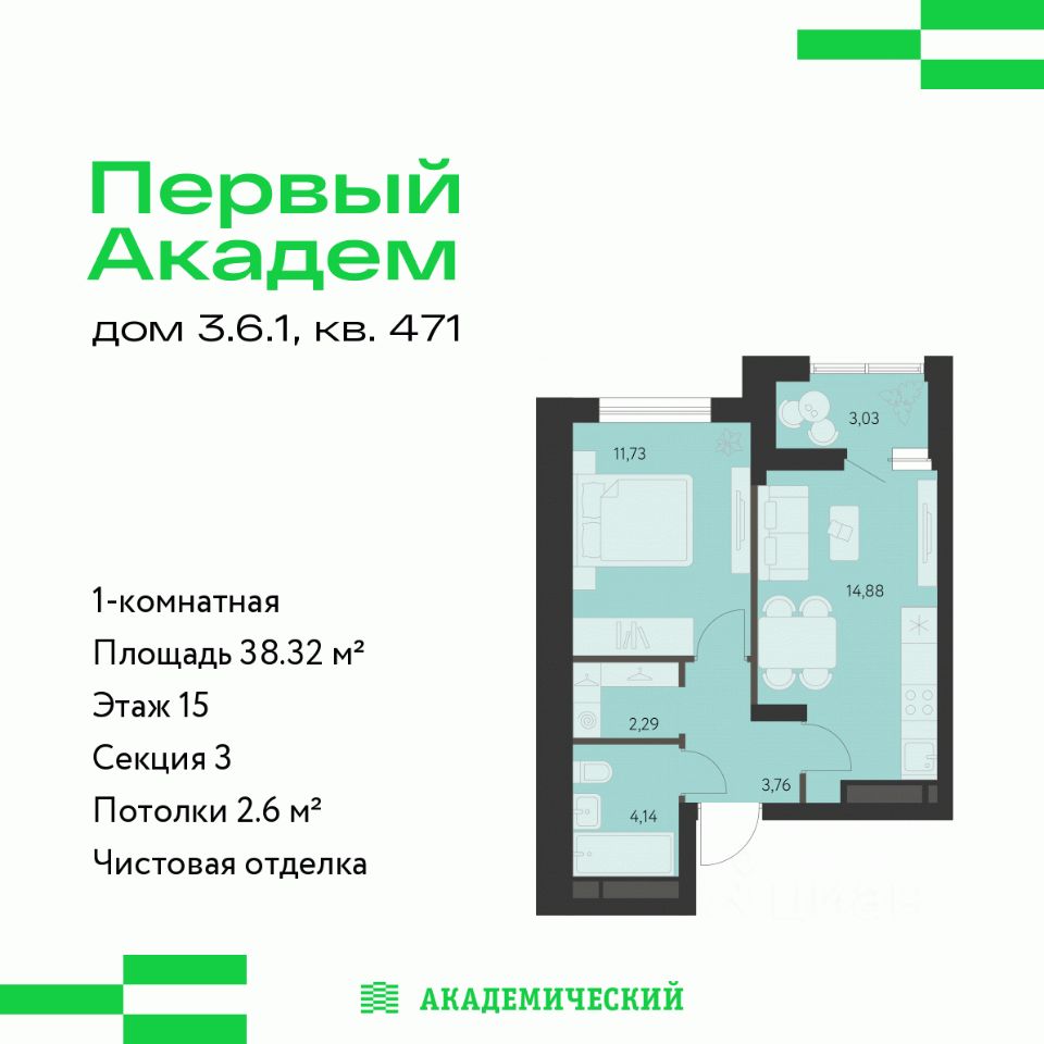 Продается 1-комнатная квартира площадью 38.32 кв.м. от девелопера "Академический" в жилом квартале "Первый Академ". Срок сдачи дома в 2026 году. Выгоды и скидка напрямую от застройщика.