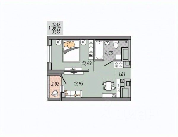 Продаётся 1-комнатная квартира в сданном доме (Дом 10), срок сдачи: II-кв. 2024, общей площадью 31.79 кв.м., на 21 этаже.