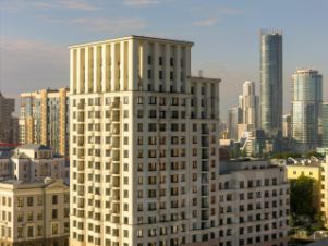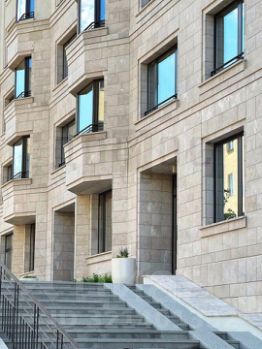 Дом находится рядом с транспортной артерией города, но в отличии от своих конкурентов, защищен от шума и пыли красивым административным зданием архитектуры неоклассицизма.