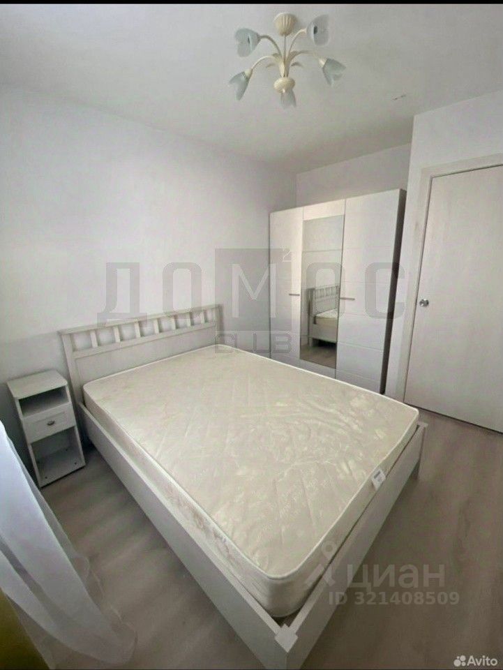 В спальной комнате установлена удобная кровать, шкаф и прикроватная тумба.