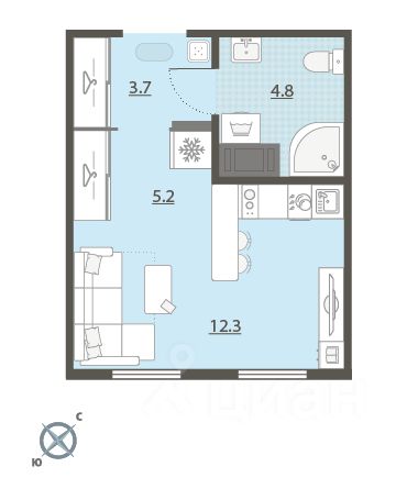 Жилая площадь 12.3 м2, кухня 5.2 м2, чистовая отделка. Раздельных санузлов - нет, балконов - нет, лоджий - нет.