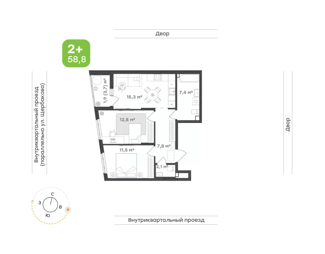 Два санузла — один с ванной и местом под стиральную машину, и второй компактный, но максимально функциональный, для комфорта всей семьи