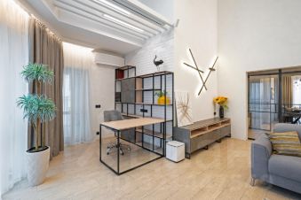Уникальность объекта состоит в его архитектурных особенностях: квартира расположена на последнем этаже, благодаря чему в гостиной есть второй свет с высотой стен 6 метров. Это позволило установить настоящий камин с живым огнём.