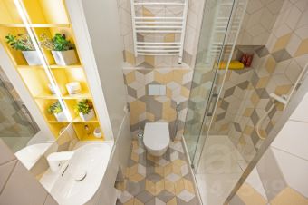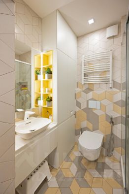 В интерьере много серых оттенков, но везде покрытие разное, поэтому создаётся обволакивающее, расслабляющее настроение. В качестве акцентного цвета в гостиной используется жёлтый, он делает интерьер свежим. А пробковое покрытие на полу способствует акустическому комфорту.