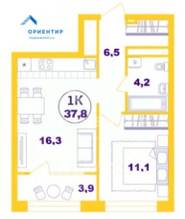 Пpocторная куxня-гостиная: 16.3 кв.м, спальня 11,1 кв.м, ванная комната 4,2 кв.м., теплая лоджия 3,9 кв.м. и прихожая с коридором 6,5 кв.м. Выcота потолков 2.7 м.