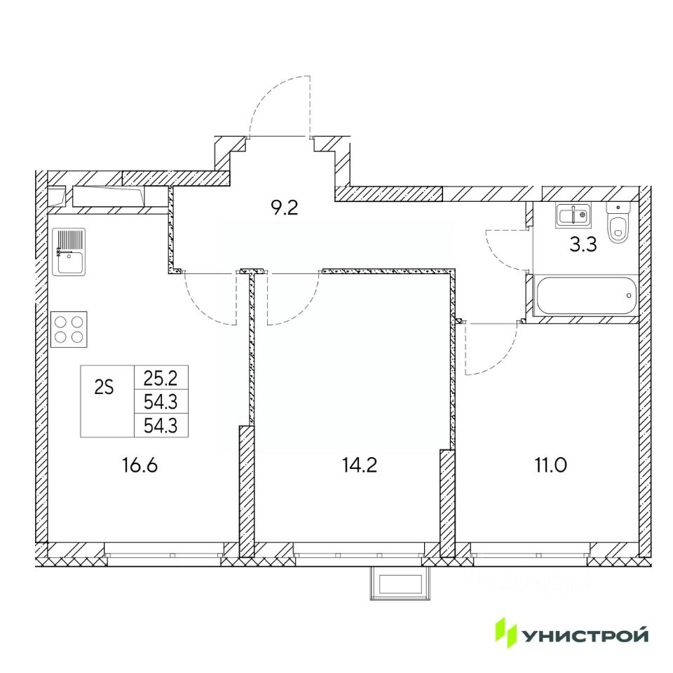 Общая площадь54,3 м²