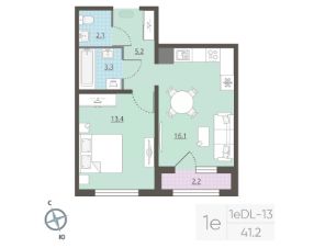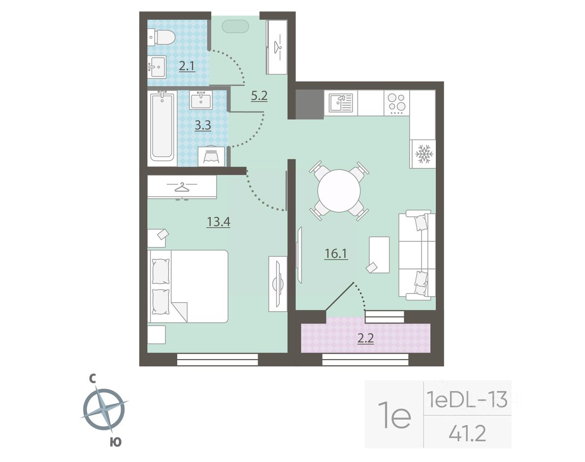 Жилая площадь 13.4 м2, кухня 16.1 м2, отделка под ключ. Раздельных санузлов - нет, балконов - нет, лоджий - 1.