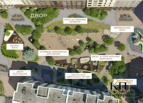 Закрытые дворы-парки без машин. Дворы похожи на мини-парки: Разновысотный ландшафт, максимальное озеленение, игровые зоны для разных возрастов, огромная песочница, место для занятий йогой, а также зона тренажеров.