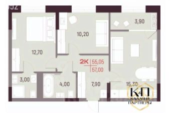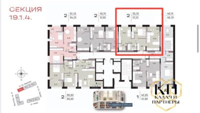 В продаже 2-комнатная квартира (евро-3) площадью 55,05